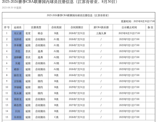 雷速体育8月30日讯 CBA官网今日更新了江苏男篮的15名国内球员注册名单。