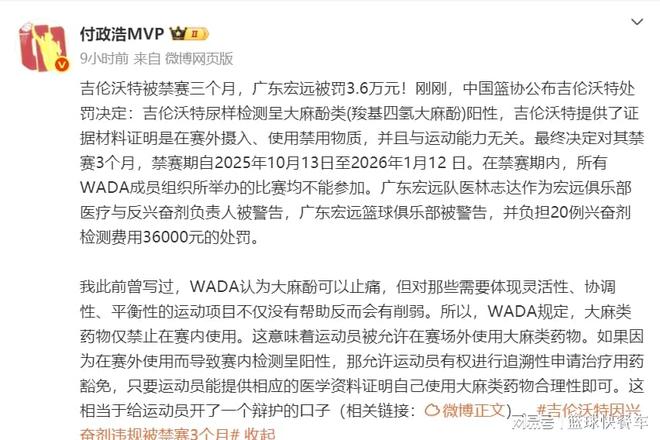 广东外援吉伦沃特终究还是逃脱不了罚单。在经过多方探讨后,中国篮协针对吉伦沃特比赛期间使用违禁药做出最终处罚。根据篮协公布的最终结果,吉伦沃特将被直接禁赛三个月,而广东队则被警告,并且被处罚3.6万罚款(承担检测费)。而颇为幸运的是,吉伦沃特和广东队这一次虽然被处罚,不过,作为球队的主教练和总经理,杜锋和朱芳雨却“幸运”的躲过罚单,并没有在处罚名单上。