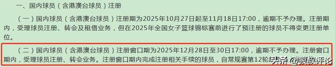国内球员(含港澳台球员)注册窗口期为2025年12月28日至30日17:00,逾期不予办理。注册窗口期内,受理球员注册、转会业务。注册窗口期内完成注册相关手续的球员,自常规赛第12轮起具备上场资格。