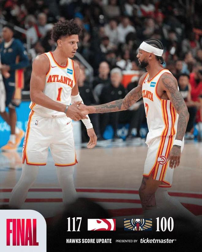 老鹰最多时刻取得25分领先优势,比赛已经提前失去胜负悬念,鹈鹕末节垃圾时间34-28追回6分,最终老鹰依然轻松117-100大胜鹈鹕完成赛季横扫。