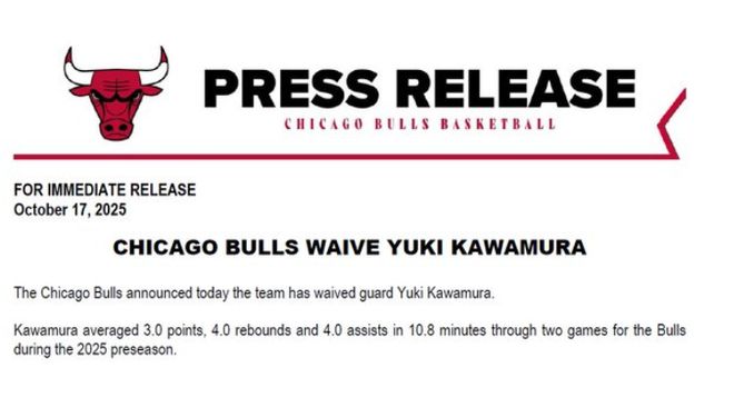 公牛官宣裁掉河村勇辉!季前赛场均3+4+4目前受小腿伤病困扰