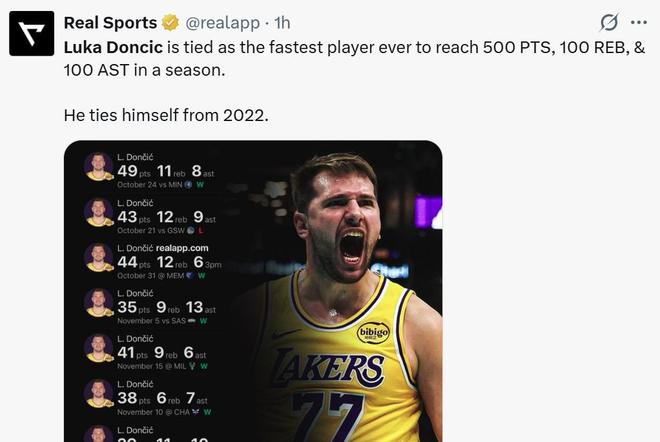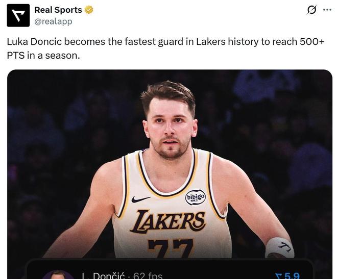 第六项:东契奇本赛季得分已突破500分,仅花费15场比赛成为湖人队史最快后卫。
