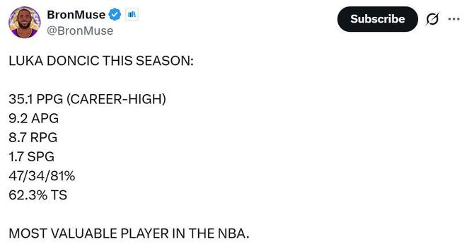 面对东契奇这样的表现,湖人媒体BronMuse也晒出数据点评道:“联盟最有价值球员。”