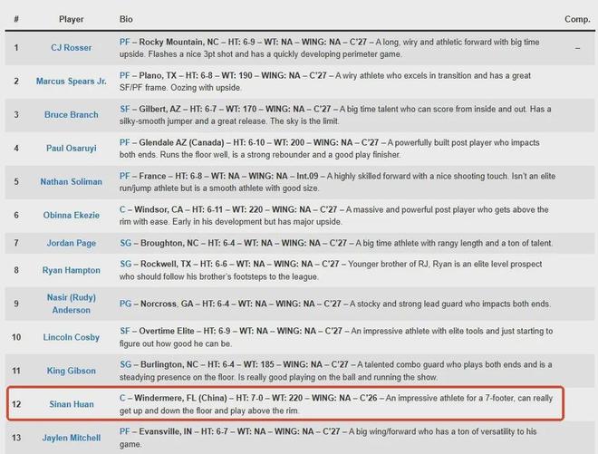 此前美媒NBA Draft Room发布了2028年选秀预测榜单,显示郇斯楠会在首轮第12顺位被选中......