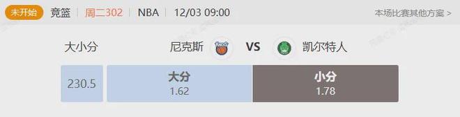 本场比赛,凯尔特人的对手,是本赛季发挥出色的尼克斯,尼克斯上一场比赛以22分大胜猛龙,近期取得了四连胜的佳绩,此番对阵绿军,从战绩上看,尼克斯要更好一些,不过凯尔特人毕竟坐拥主场优势,且球队近期四战三胜,状态也很不错,结合阿奴诺比和沙梅特目前无法上场的情况,胜负变得难以判断,但在比分方面,绿军多名主要得分手有伤在身,这使得他们的进攻火力有所下滑,而尼克斯一方,球队近期打出了非常不俗的防守表现,成功限制了猛龙的进攻,结合两队近期交锋,比分都偏低的情况,小比分,或许是本场的最优解。