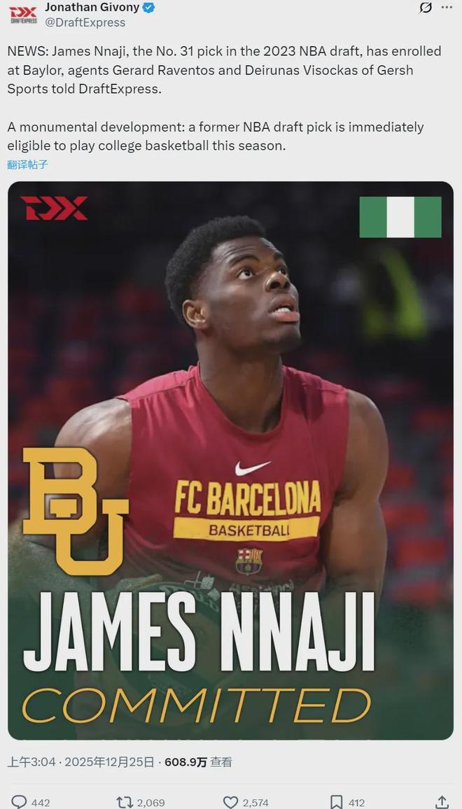 北京时间12月25日,据NBA选秀专家Jonathan Givony报道,2023届NBA的31号秀詹姆斯-纳吉加盟贝勒大学,已经完成注册,他将参加本赛季NCAA比赛。另一个选秀记者Joe Tipton透露,纳吉获得了NCAA授予的四年参赛资格。