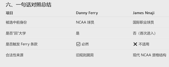纳吉并不是重返NCAA,因为他压根就没打过NCAA,所以“费里规则”限制不了他。詹姆斯-纳吉出生于2004年8月14日,身高2米08,臂展2米26,体重102公斤。纳吉是尼日利亚球员,身体天赋出色,防守面积大,但技术太粗糙了。