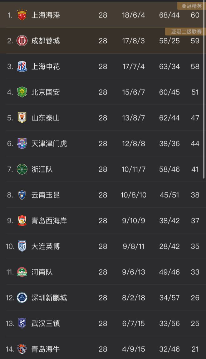 本轮过后,60分的海港依然领跑,不过领先优势缩小至1分。蓉城积59分排名第2位,申花58分排名第3。依然保持争冠希望的2队,将在最后2轮展开决战。