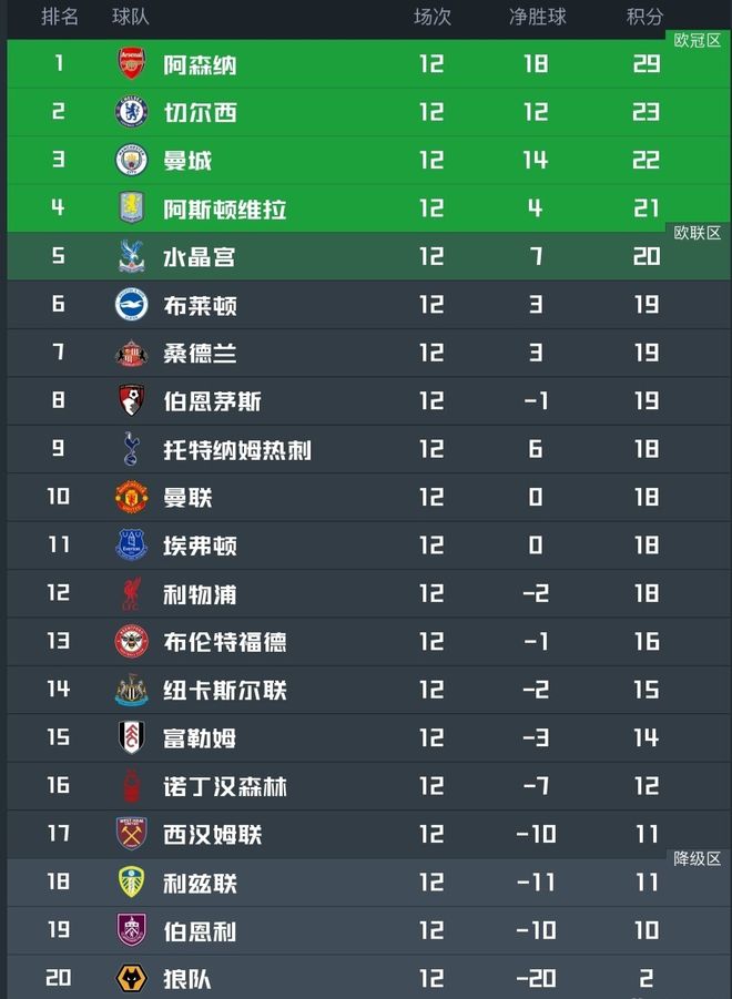 阿森纳笑晕争冠3对手同轮翻车!6分断层领跑第2至第12仅差5分