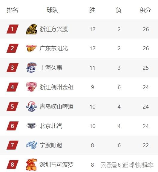CBA积分榜最新排名出炉!广厦广东稳居前2:辽宁队已下滑至第11