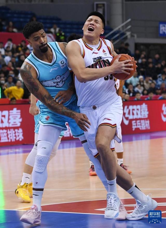 1月15日,青岛崂山啤酒队球员王睿泽(左)在比赛中防守吉林长白山恩都里队球员贾昊。新华社记者 李紫恒 摄