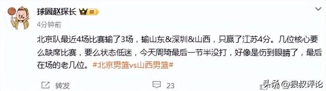 北京队最近4场比赛输了3场,输山东&深圳&山西,只赢了江苏4分。几位核心要么缺席比赛,要么状态低迷,今天周琦最后一节半没打,好像是伤到眼睛了,最后在场的老几位。