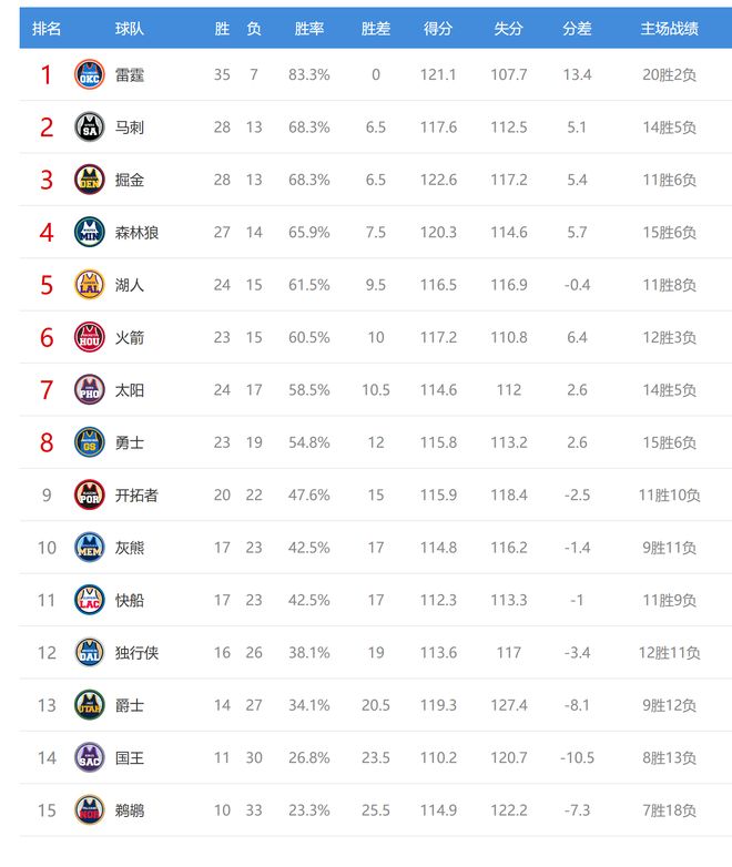 今日比赛后马刺、掘金排名互换,其他西部球队排名不变。