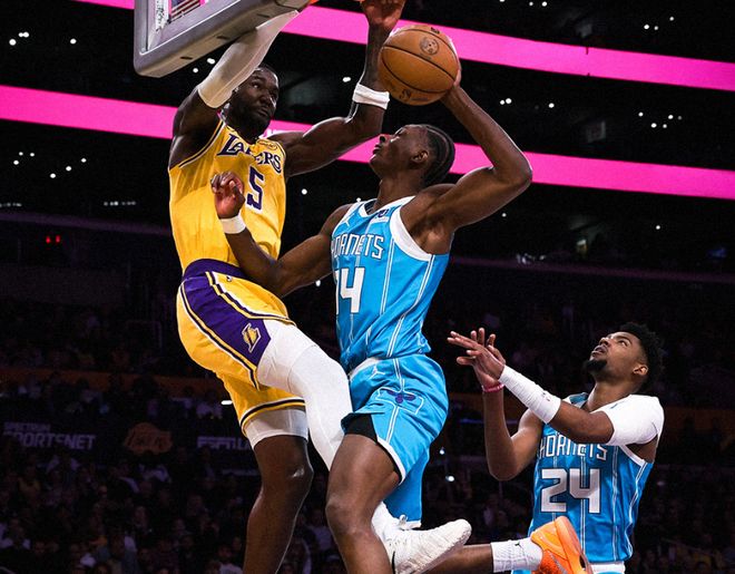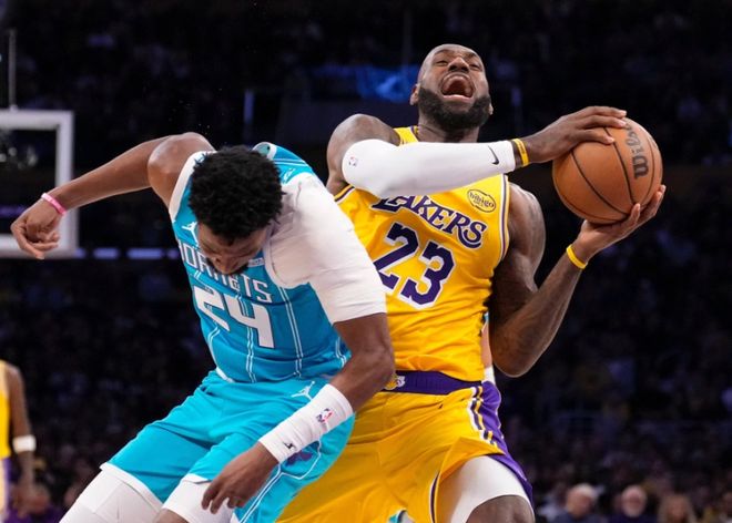 但塞恩詹姆斯上反篮,塞克斯顿反击上篮,湖人几个失误,又被拉开分差。三节打完,湖人93-104黄蜂。决战第四节,拉拉维亚和斯玛特带队追到只差6分,但迪亚巴特轻松上篮,鲍尔又中超远三分,克尼佩尔强攻打板命中,湖人又被拉开分差。中段东契奇和鲍尔对轰三分,布里奇斯弹无虚发,黄蜂拉开17分分差。湖人没放弃,范德比尔特补篮+老詹上篮,鲍尔两记三分杀死比赛!最终湖人117-135惨败黄蜂。