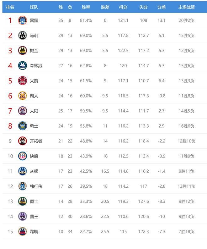 北京时间2026年1月18日,今日NBA有9场比赛,湖人、勇士、掘金、马刺、雷霆、森林狼、太阳、开拓者、独行侠、爵士参与其中,赛后西部排名有什么变化呢?