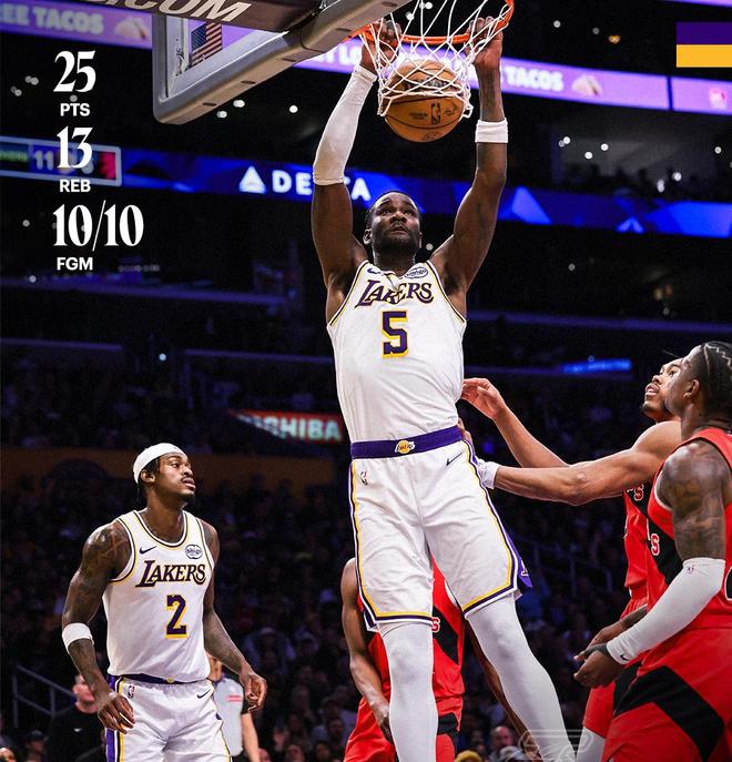 湖人队内线猛将艾顿,在此役强势暴走。艾顿出战33分钟,10投全中,6罚5中,狂轰25分13板1助攻1帽的两双数据。艾顿以100%的命中率轰下了全场的最高分,他还是此战的篮板王。攻防两端,艾顿都打出了堪称完美的表现。