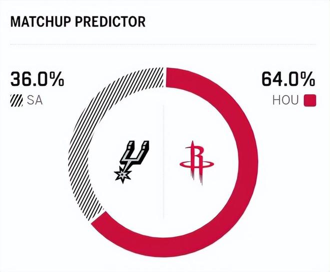 本赛季两队首次交锋,马刺在主场以11分之差战胜火箭;但近6次交手,火箭取得了4胜2负的战绩,占据一定优势。赛前,美媒ESPN对本场比赛进行了胜率预测,火箭队胜率依旧高达64.0%,占据绝对上风,马刺胜率则仅有36.0%,意外不被看好。