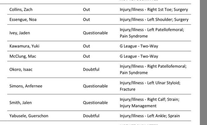 公牛队这边缺阵的人更多,他们有4位球员缺阵,5位球员出战成疑。扎克科林斯因为右大脚趾手术,本场比赛缺阵,艾森格因为左肩手术缺阵,另外,后卫河村永辉以及扣篮王麦克朗都被下放到发展联盟,他们这场比赛也不会回归。公牛队还有5位球员因为受伤出战成疑,分别是奥科罗、安芬尼西蒙斯、杰登艾维、杰伦史密斯以及亚布塞莱。