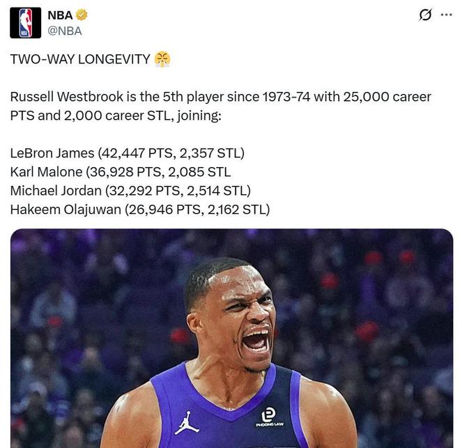 除此之外,威少在本场比赛之后也成为NBA历史上第二位能够拿到至少25000分2000次抢断的后卫球员,第一人是篮球之神乔丹。