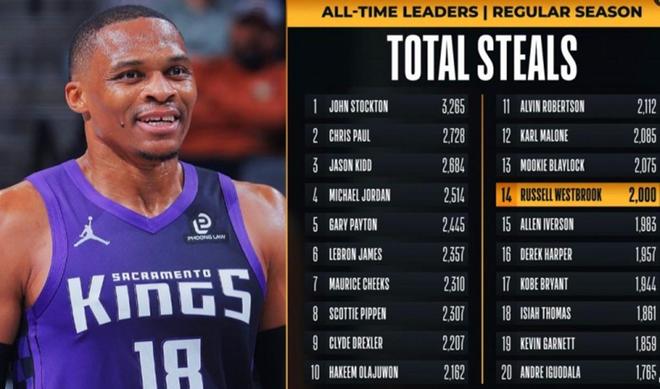 凭借这样的表现,威少一战迎来两大里程碑,首先是抢断总数突破2000大关,成为NBA历史上第14位完成这一壮举的球员。