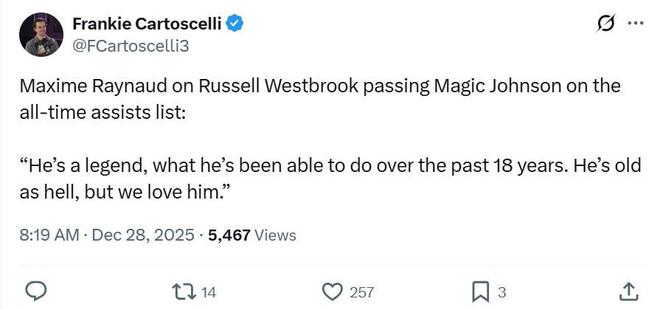 面对威少这样的表现,国王新秀雷诺赛后接受采访,直言威少就是行走着的传奇。