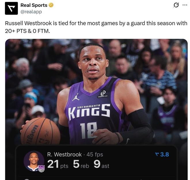 在德罗赞失准、拉文和小萨缺席的情况下,国王队能够拿下胜利,威少无疑是第一大功臣,全场威少16中8,三分9中5高效拿下21分5板9助1断。