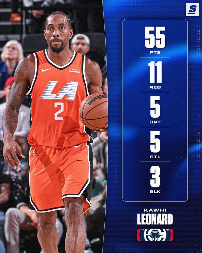 小卡在此役还创下了两大NBA历史第1的神迹。第1、数据显示,莱昂纳德单场至少55分10篮板5抢断3盖帽,是NBA历史首次出现。