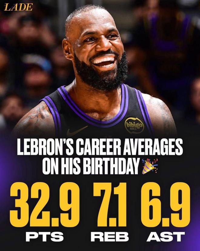 詹姆斯正式年满41周岁,作为现役最老的球员依然肩负率领湖人前进的重任。在詹姆斯生涯前10次NBA生日之战,他场均得到32.9分成为NBA生日夜场均得分最高的球员,力压威尔金斯场均32.7分与库里、奥尼尔场均29.4分。