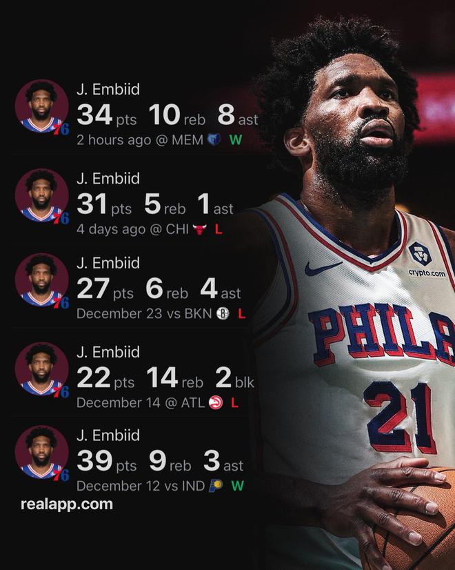 因为膝盖伤病已经彻底摧毁了恩比德的爆发力与敏捷度,他在进攻端完全是在依靠技术功底与吹罚优势打出漂亮数据。