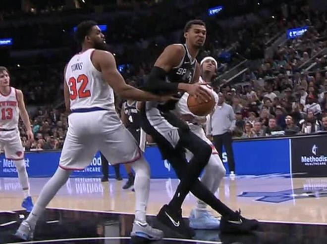 与尼克斯比赛的第四节,文班亚马在一次篮板球争夺落地时疑似左膝过度伸展,随后他的表情十分痛苦,一瘸一拐返回更衣室。