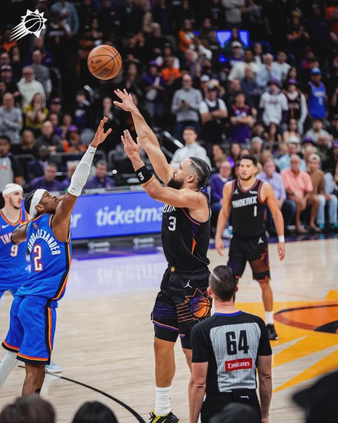 霍姆格伦两分打进,比分变成105-103。太阳前场边线球,狄龙自己运球出界,把球权还给雷霆。太阳不让亚历山大接球,杰威中距离跳投,帮助雷霆追至105-105。接下来是布克的表演时间,迎着卡鲁索命中三分,只剩下0.7秒!