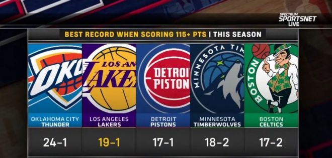 首先,本赛季赛季以来,湖人得分115+球队战绩为19胜1负,全联盟仅次于雷霆。