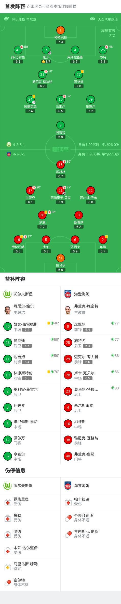 沃尔夫斯堡11海登海姆,阿德里安贝克首开记录,延茨救主