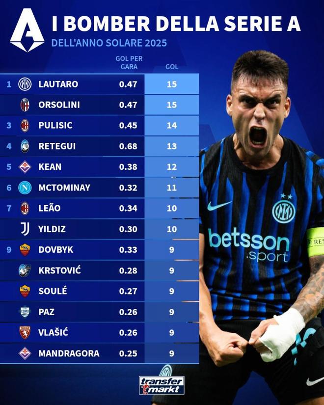 意甲2025年射手榜:劳塔罗15球并列第1,普利希奇14球第2