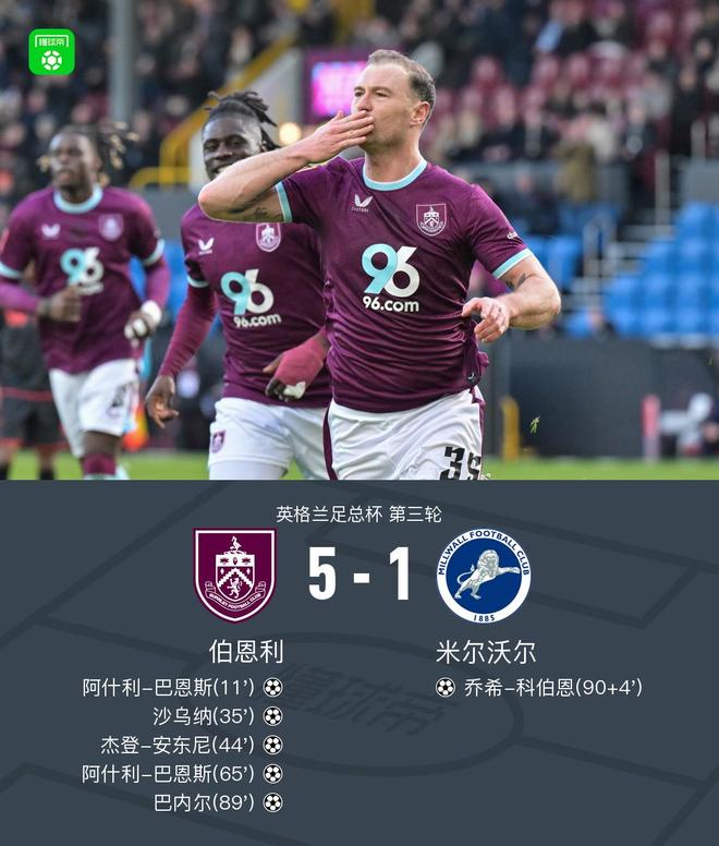 伯恩利51米尔沃尔,36岁巴恩斯双响,拉森助攻梅开二度
