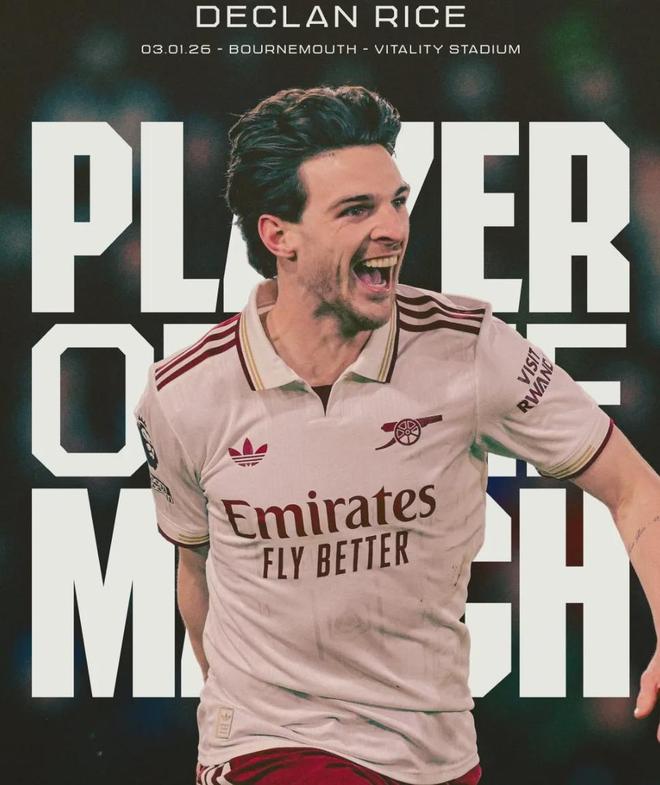 赖斯被英超和阿森纳官方评为了本场比赛最佳球员。